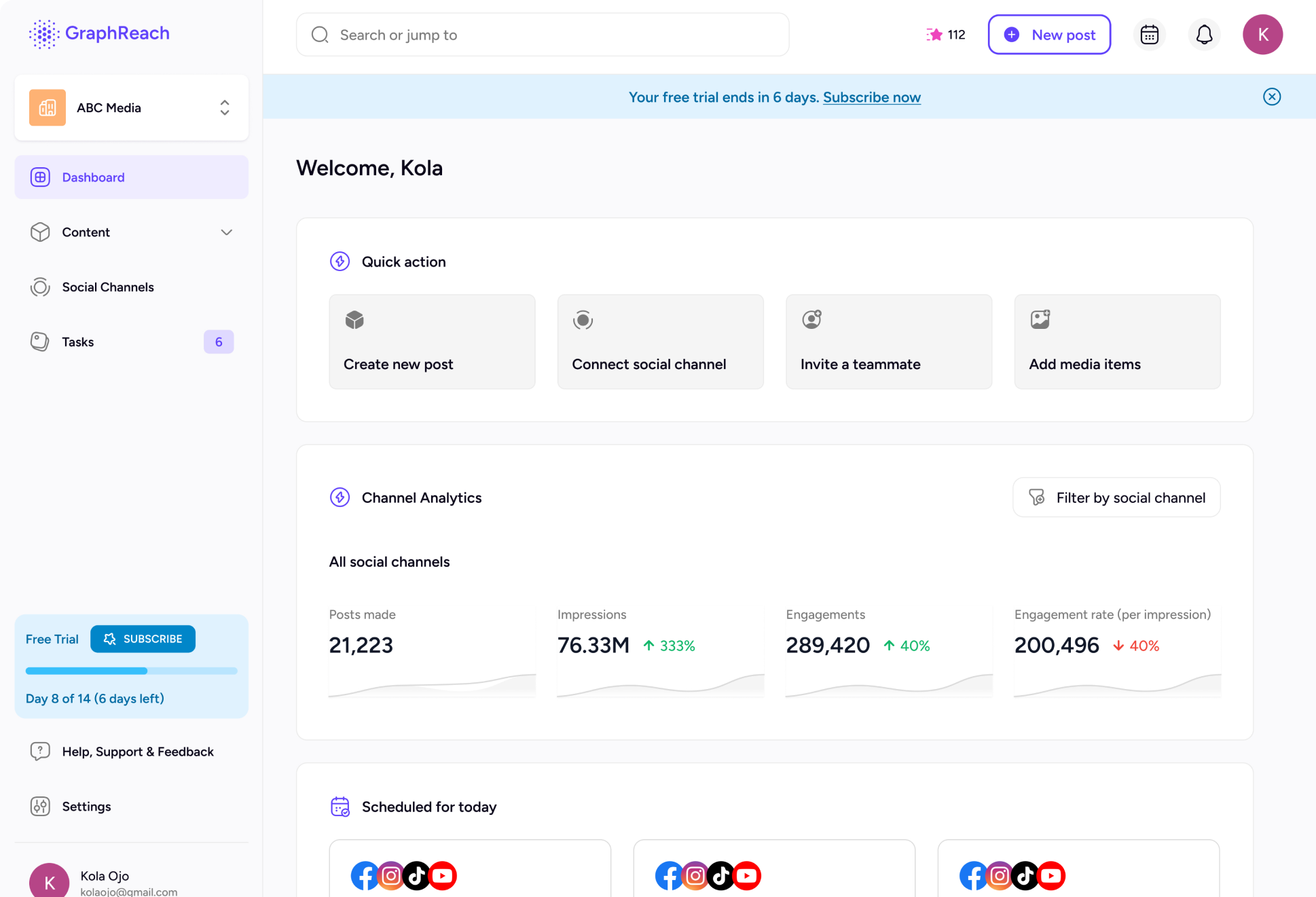 Say goodbye to creative blocks and inconsistent posting schedules. Our AI-driven content creation tools guide you from ideation to execution with tailored templates, content recommendations, and planning features. With GraphReach, you can plan, schedule, and distribute your content seamlessly across platforms like Instagram, Twitter, LinkedIn, and more—all from one centralized dashboard.
